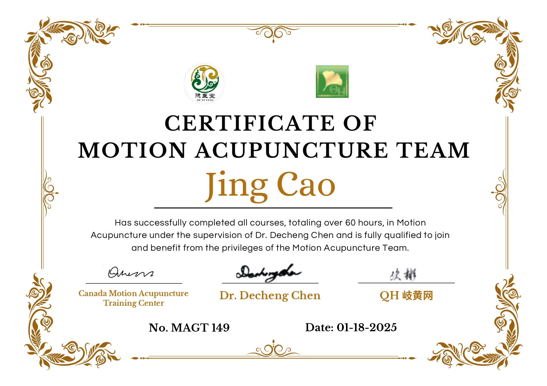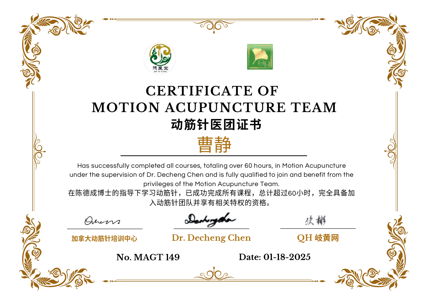 Motion Acupuncture is an innovative acupuncture technique pioneered by Dr. Chen Decheng. This approach integrates traditional acupuncture methods with modern theories of Anatomy, fasciology, physiology, and kinesiology. It aims to treat and prevent diseases through special acupuncture techniques and dynamic needle retention. Dr. Cao has been certified with motion acupuncture training program.